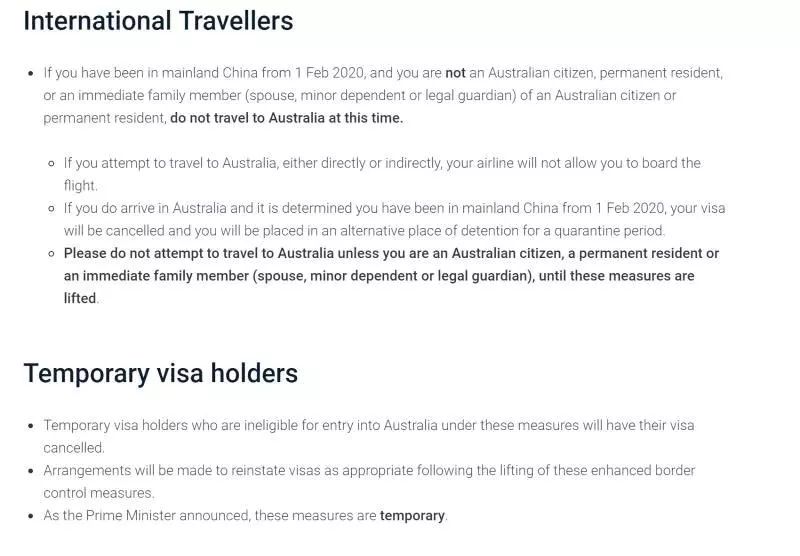 从2020年2月1日开始,除了澳大利亚公民、永久居民及他们的监护人、子女和配偶外,凡在14天内曾到达过或经过中国的,都不能入境澳洲。(时间按照到达澳洲当日开始往前推算)。此项临时规定含起飞地或途经地是中国。禁止进入政策只是一项临时措施,14天后会重新评估,或在14天后取消。