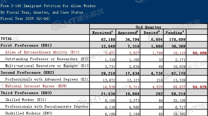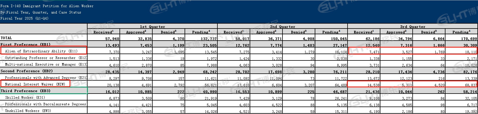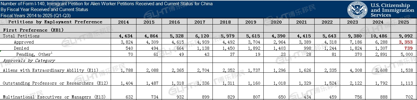 2025年(Q1--Q3)EB-1获批3353份,拒签739份,获批率为:81.94%。较2024年(获批率为82.79%)下滑。