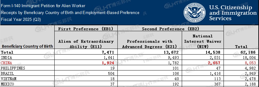 2025财年Q3,中国申请人共递交I-140移民申请8053份,其中:EB-1A移民1924份;NIW移民2,657份。