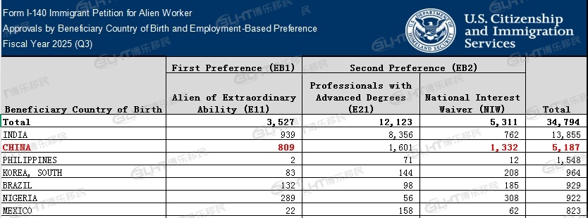 2025财年Q3,中国申请人共获批I-140移民申请为5187份,其中:EB-1A移民为809份;NIW移民为1332份。