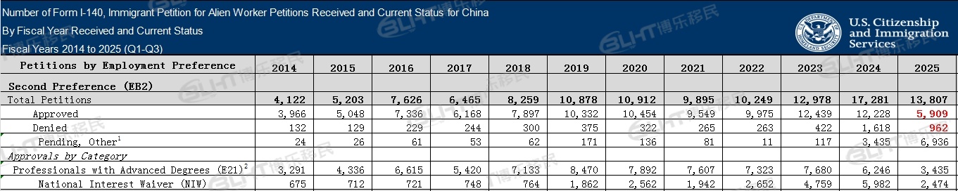 2025年(Q1--Q3)EB-2获批5909份,拒签962份,获批率为:86.00%。较2024年(获批率为88.31%)略有下滑。