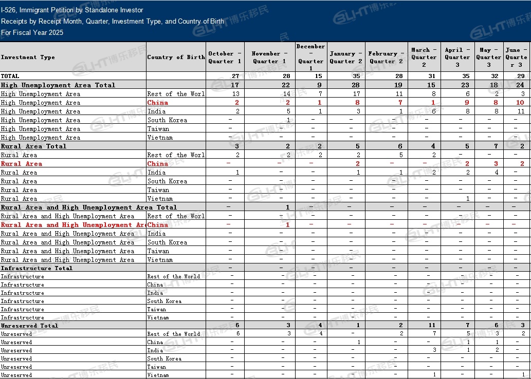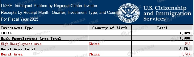 2025财年,在高失业率和乡村项目这两个类别中,中国大陆的申请量占比已经超过了全球数量的40%,和同处于旧政EB-5排期中的印度一起,成为预留签证项目中,申请量占比 * 的两个国家。